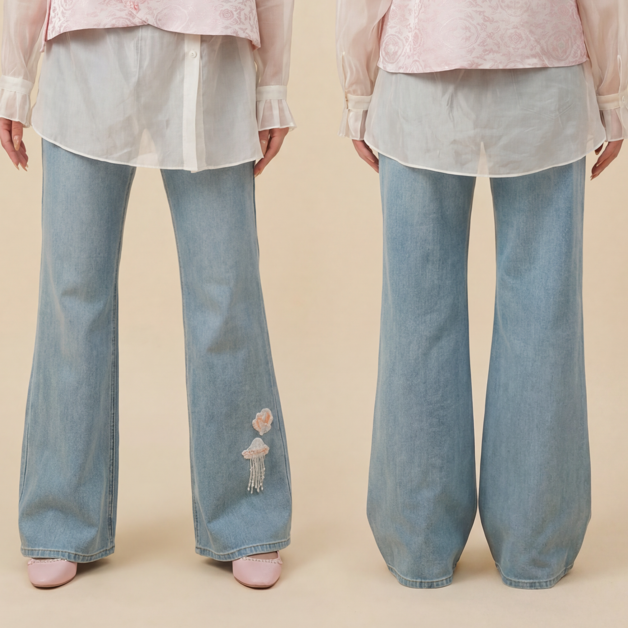 Baroque Blossom-巴洛克绽放-Pearl-Embellished Jellyfish & Shell Design Denim Pants